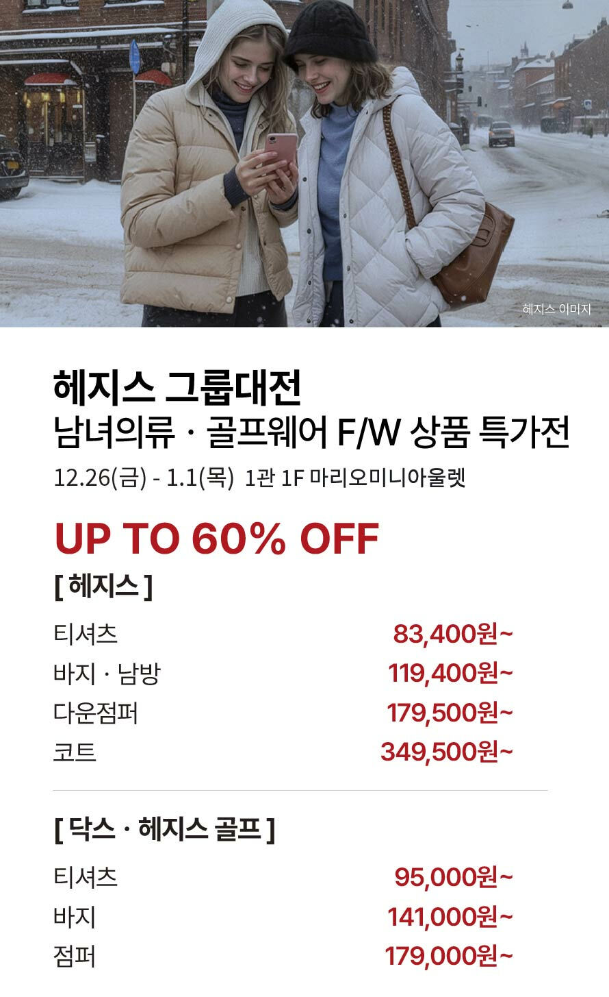 [헤지스 그룹대전] 남녀의류/골프웨어 F/W 상품 특가전 (2025-12-26 ~ 2026-01-01)