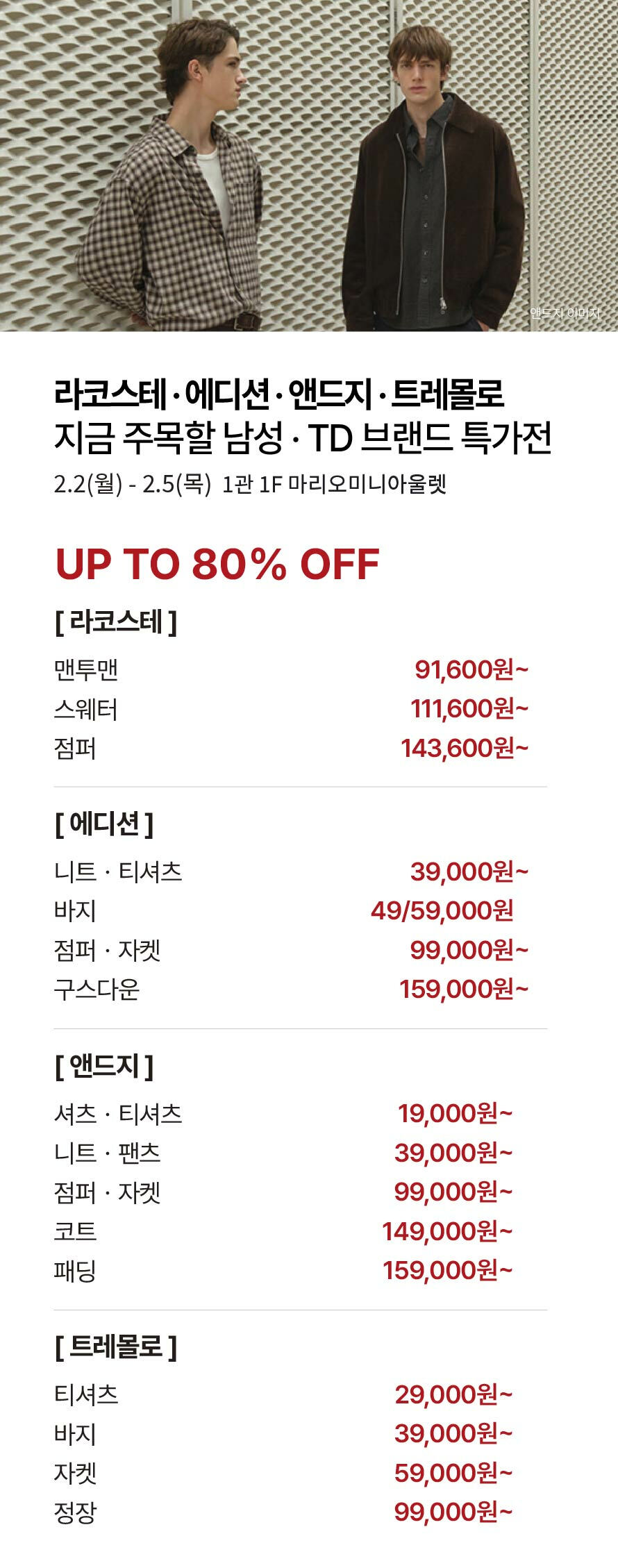 [라코스테·에디션·앤드지·트레몰로] 지금 주목할 남성·TD 브랜드 특가전 (2026-02-02 ~ 2026-02-05)