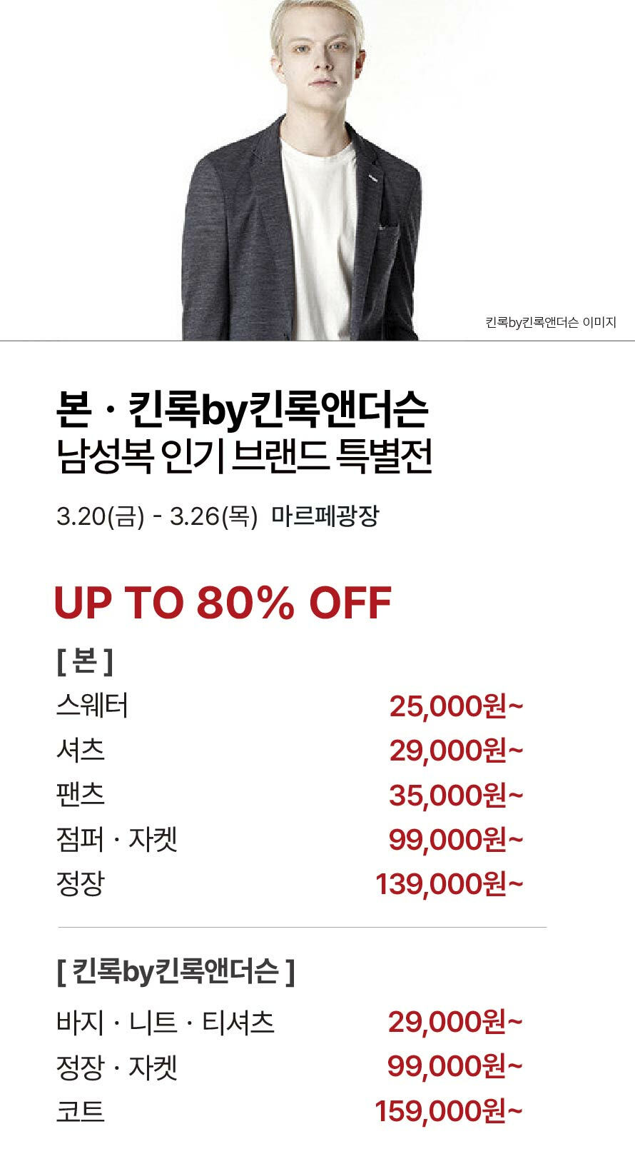 [본·킨록by킨록앤더슨] 남성복 인기 브랜드 특별전 (2026-03-19 ~ 2026-03-26)