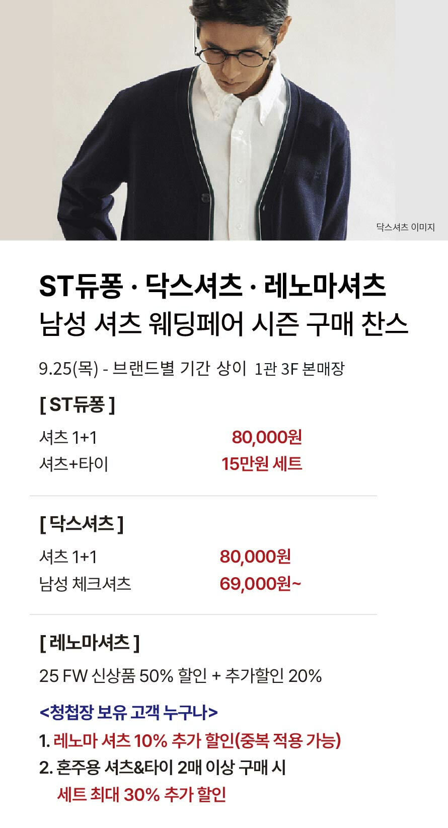[ST듀퐁 · 닥스셔츠 · 레노마셔츠] 웨딩시즌 남성셔츠 구매찬스 (2025-09-25 ~ 각 브랜드 별 기간 상이)