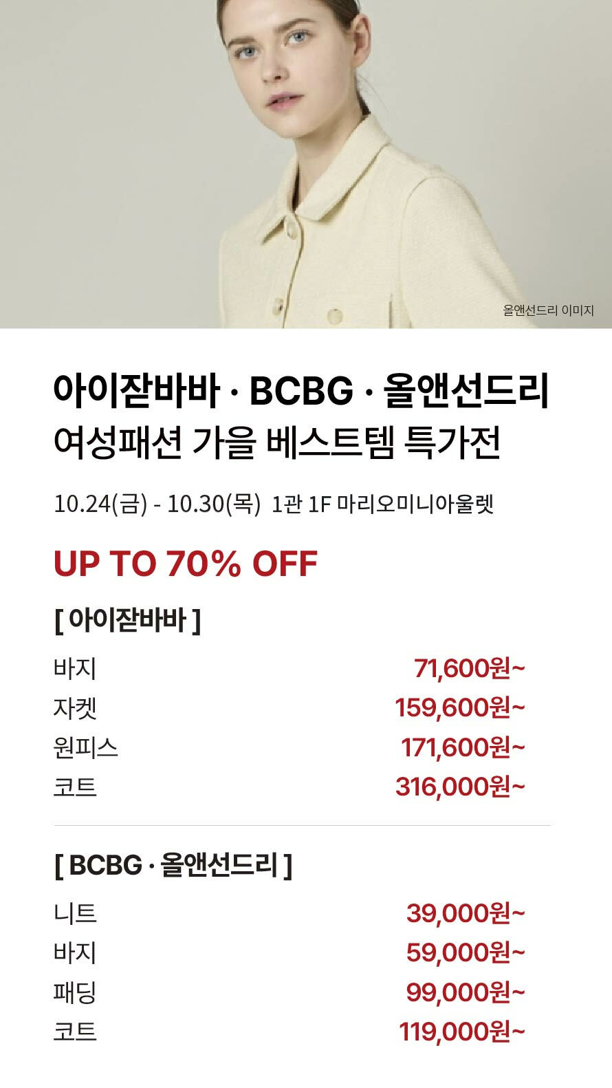 [아이잗바바·BCBG·올앤선드리] 여성패션 가을 베스트템 특가전 (2025-10-24 ~ 2025-10-30)