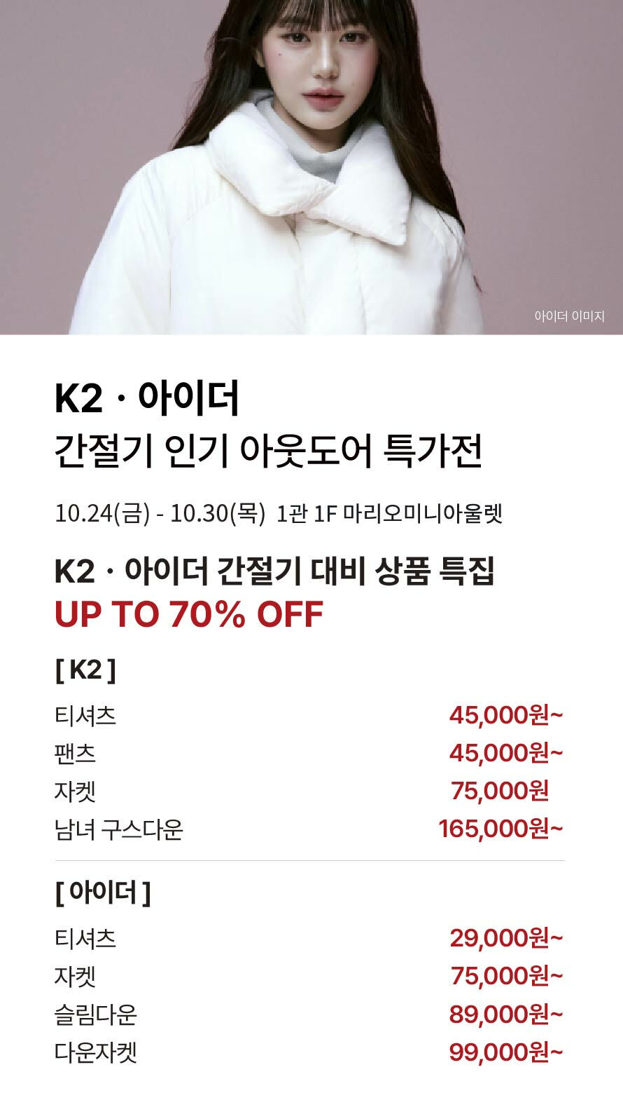 [케이투·아이더] 간절기 인기 아웃도어 특가전 (2025-10-24 ~ 2025-10-30)