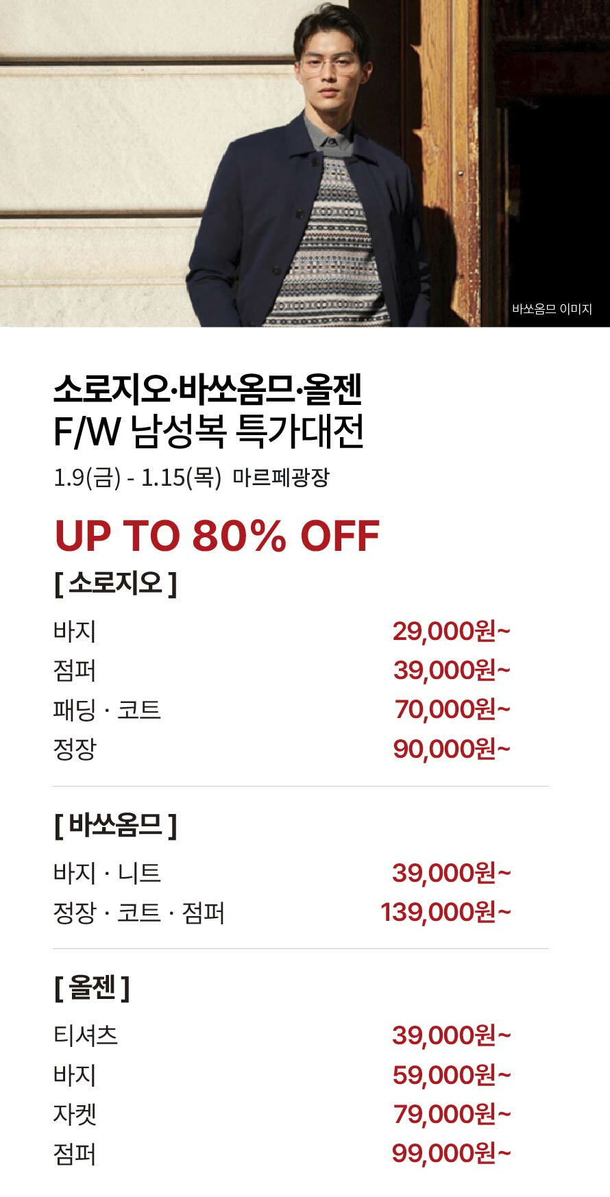 [소로지오·바쏘옴므·올젠] F/W 남성복 특가대전 (2026-01-09 ~ 2026-01-15)