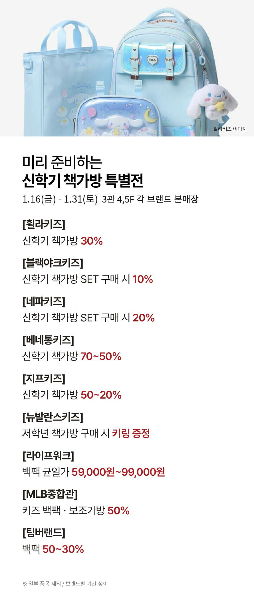 미리 준비하는 신학기 책가방 특별전 (2026-01-16 ~ 각 브랜드 별 기간 상이)