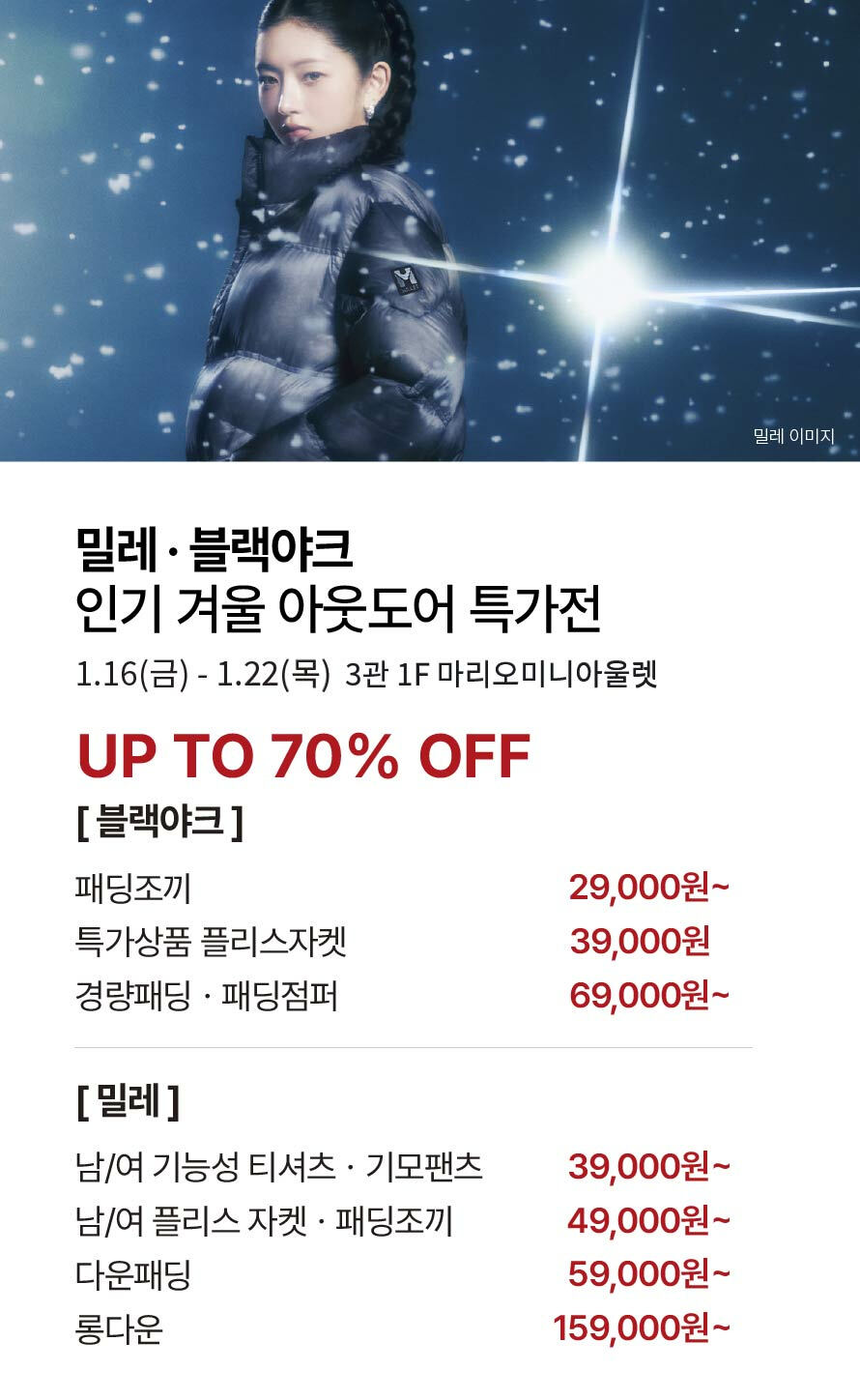 [밀레·블랙야크] 인기 겨울 아웃도어 특가전 (2026-01-16 ~ 2026-01-22)