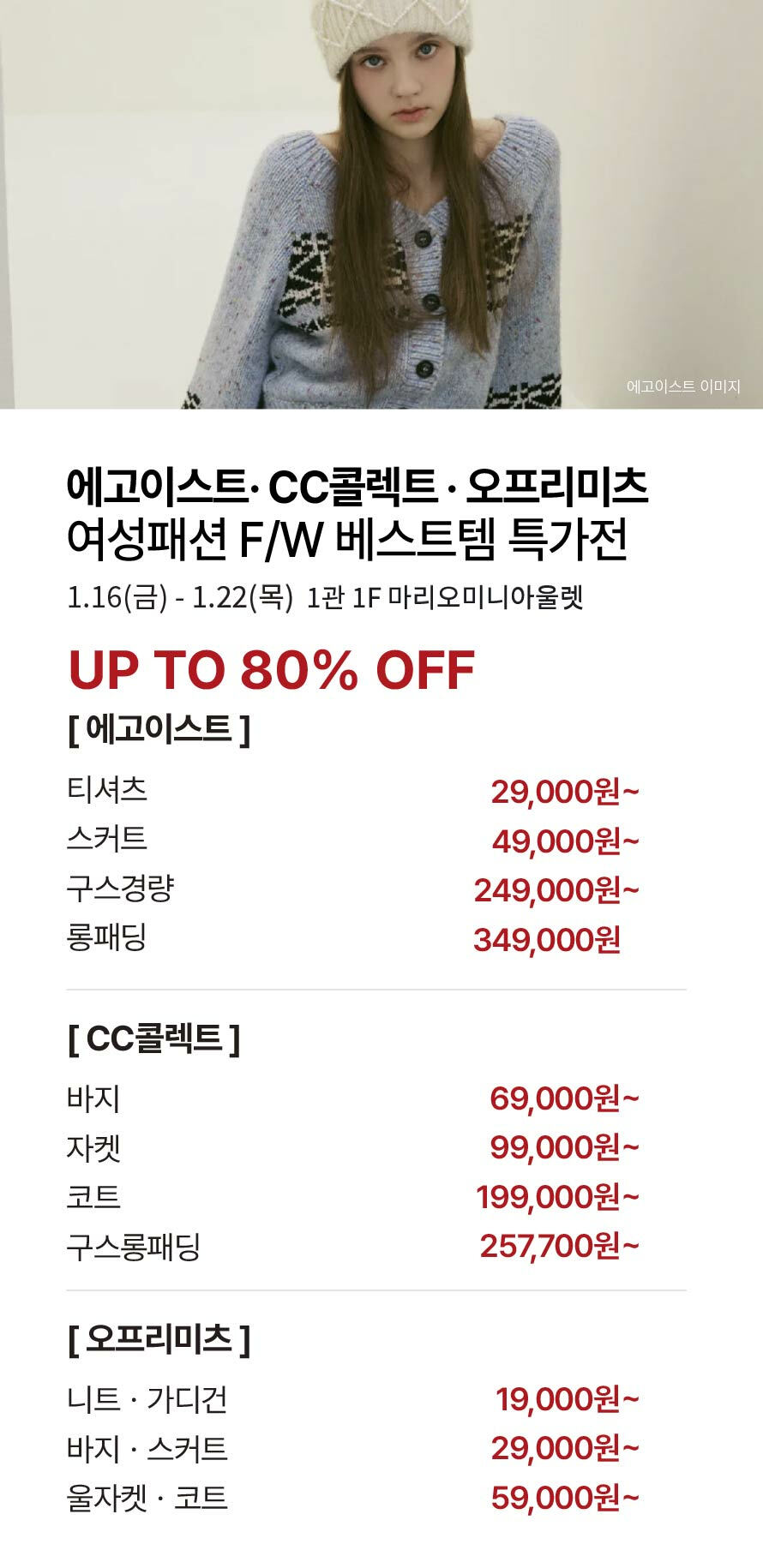 [에고이스트·CC콜렉트·오프리미츠] 여성패션 F/W 베스트템 특가전 (2026-01-16 ~ 2026-01-22)
