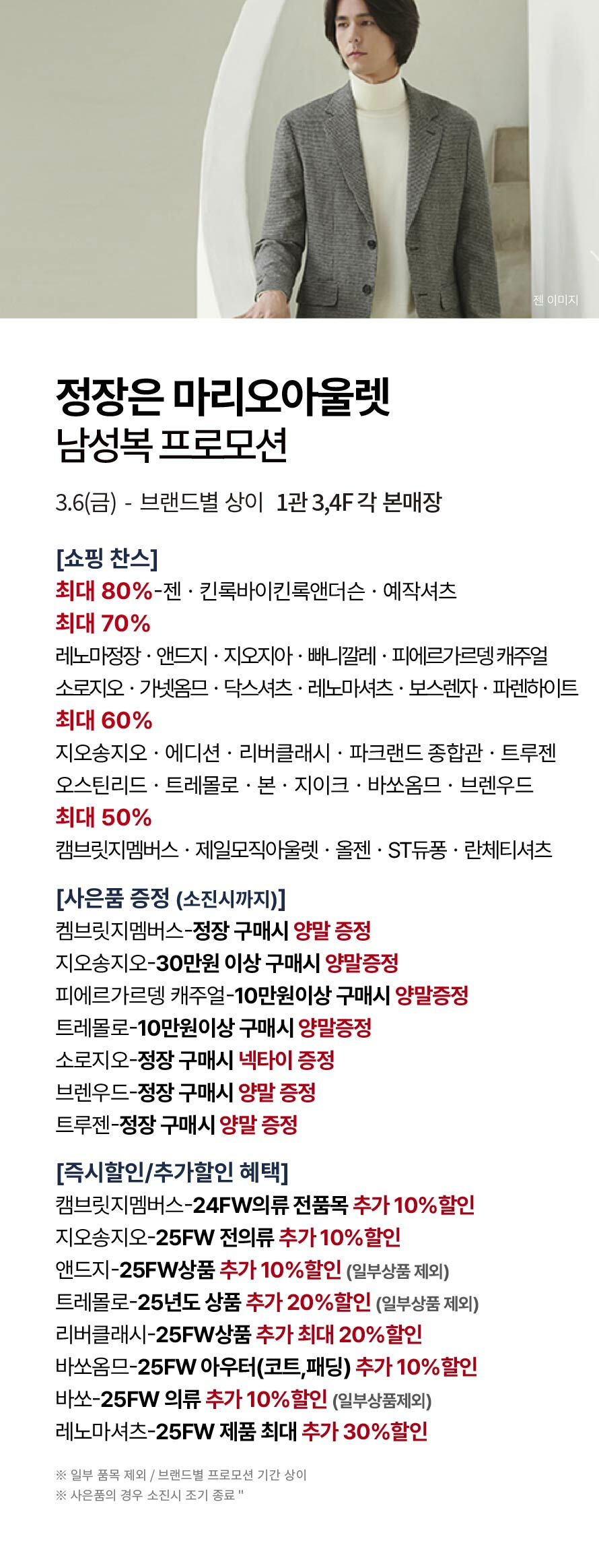 [정장은 마리오아울렛] 남성복 프로모션 (2026-03-06 ~ 각 브랜드 별 기간 상이)