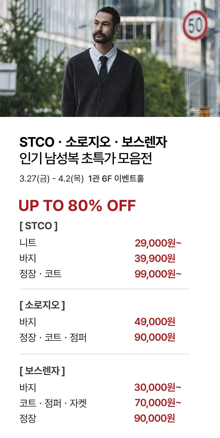 [STCO·소로지오·보스렌자] 인기 남성복 초특가 모음전 (2026-03-27 ~ 2026-04-02)